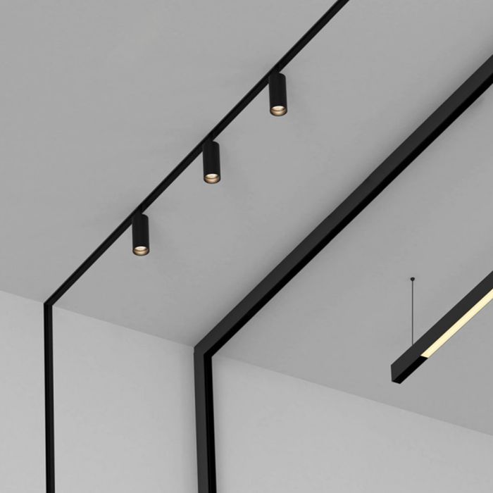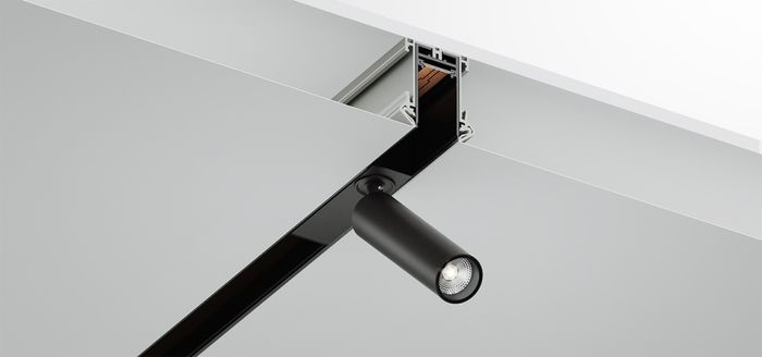 Встраиваемые шины монтируются в потолок – гипсокартонный, реечный, любой другой. Теперь их совмещают и с натяжными потолками. Стыки и крепеж не заметны, светильники утоплены в профиль и образуют с ним единую ровную поверхность, а сам шинопровод не выступает за плоскость потолка.