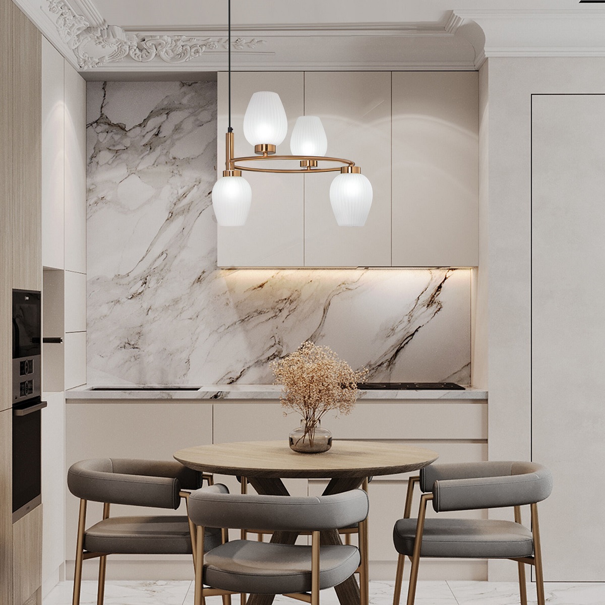 Незаурядная модель 30183/4 латунь от российской компании Eurosvet относится к коллекции Alva и отлично подойдет для установки на потолок кухни, оформленной в стиле модерн. Подвесная люстра Eurosvet Alva 30183/4 латунь с плафонами в виде бокалов осветит помещение площадью 5 кв. м. Производитель Eurosvet рекомендует использовать для устройства галогеновые лампы с цоколем G9 и мощностью 25 W. Прибор произведен с использованием материалов: металл и стекло и может использоваться для натяжного потолка. Основным цветом товара является белый. Подвесная люстра 30183/4 латунь продается по цене 16600 руб. Торопитесь сделать заказ в интернет-магазине ВамСвет.