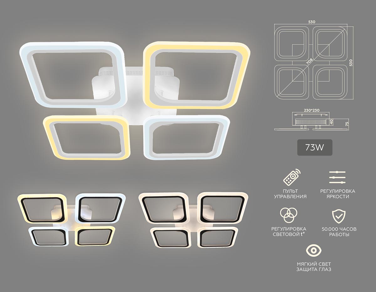 светодиодных лампПодходит для низких потолковДаПульт ДУДаНаличие диммераДаТип управленияпульт ДУЦвет свеченияОт теплого до холодногоСрок службы10 летГарантия производителя2 годаГарантия магазина12 месяцевРазделКаталог