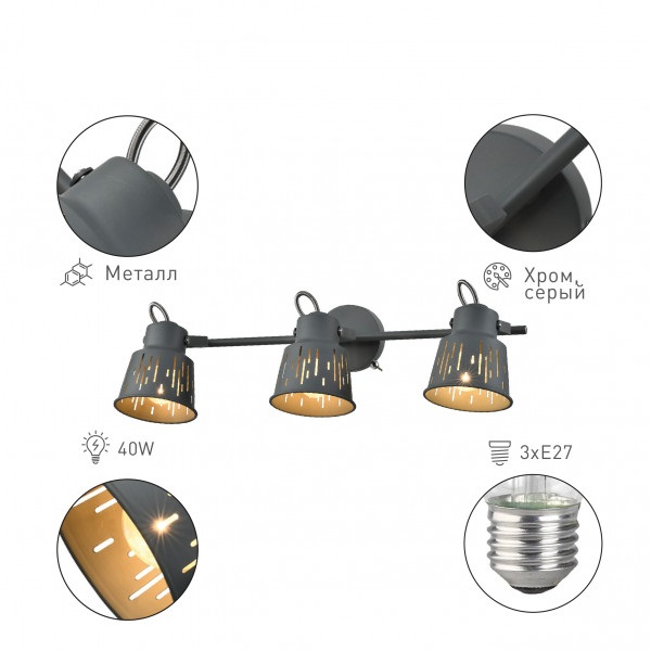 данной категорииМатериал арматурыМеталлМатериал плафоновМеталлНаправление плафоновПоворотноеВид рассеивателяПлафонФорма рассеивателяПосмотреть другие товары
