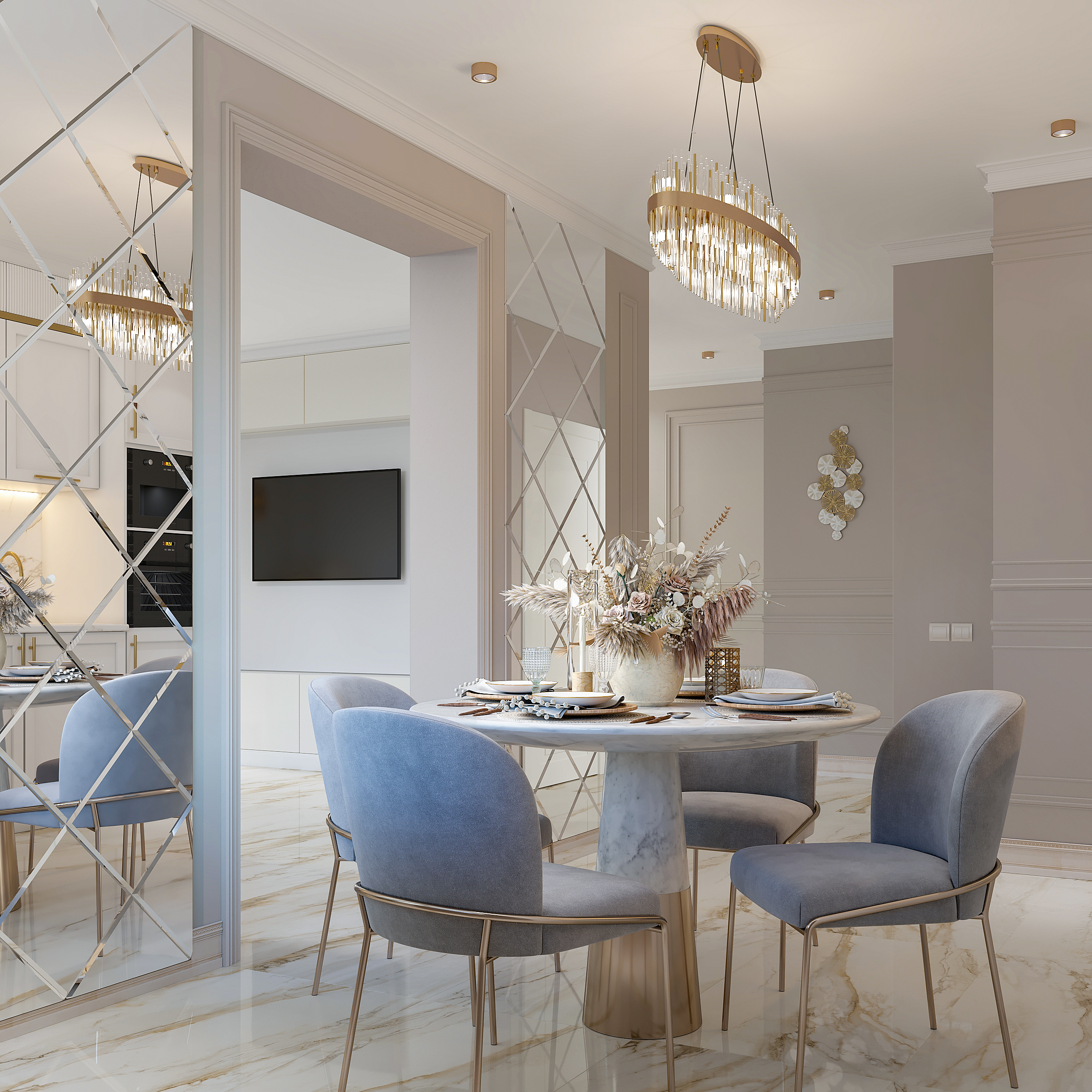Для добавления уюта над обеденным столом повесили тройной светильник с природными оттенками.