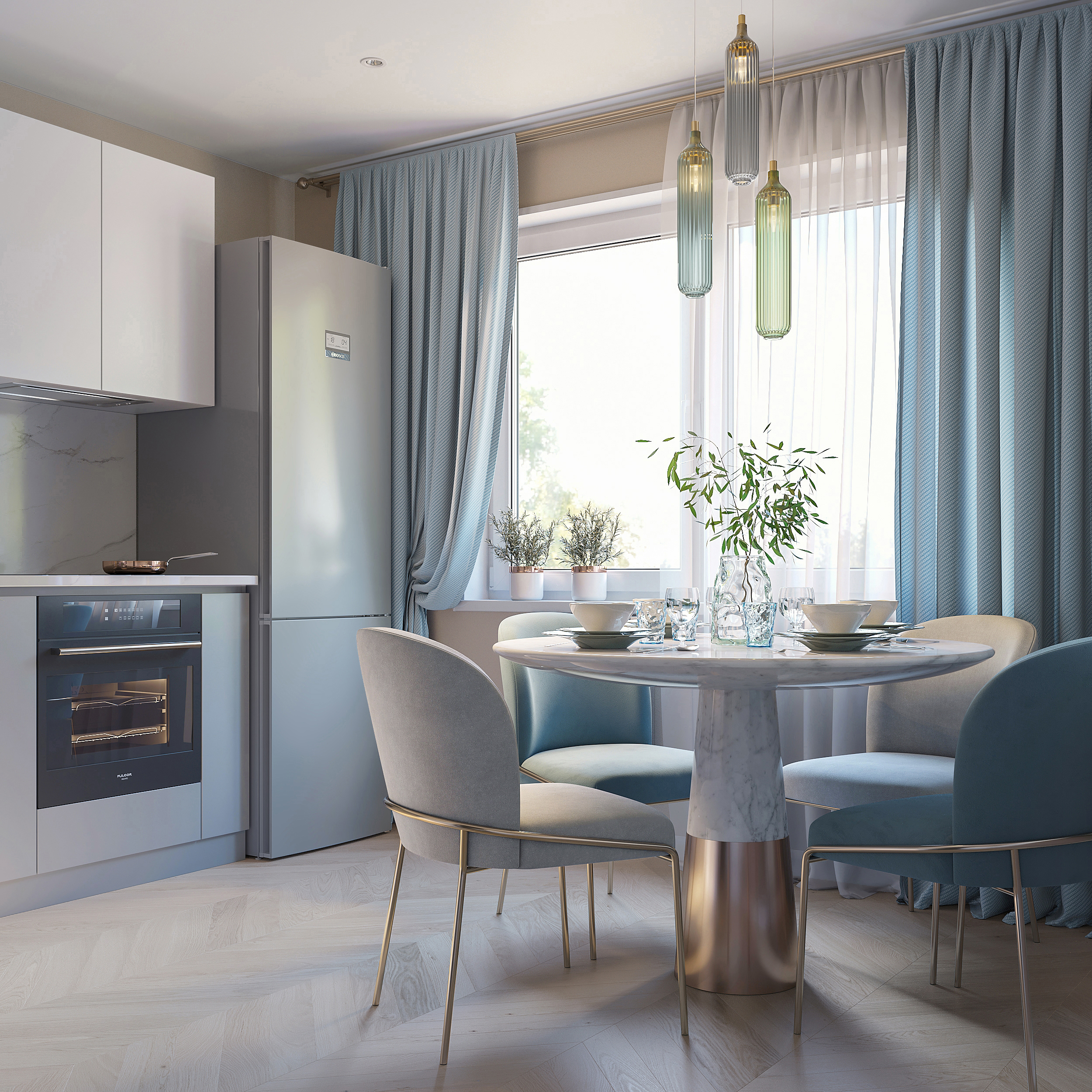 Применили пепельно -розовые, серые и белые цвета в интерьере.