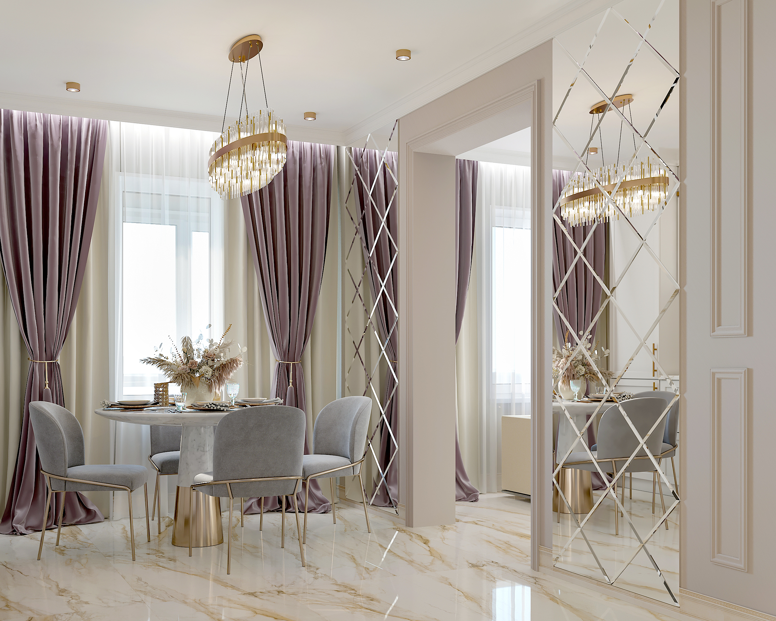 Применили пепельно -розовые, серые и белые цвета в интерьере.